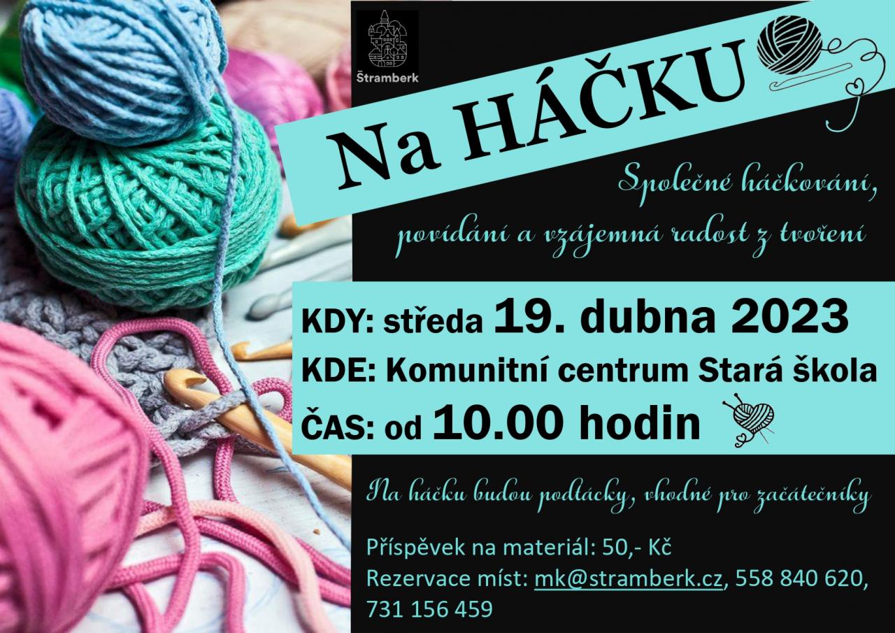 Knihovna Štramberk zve všechny kreativní duše na společné háčkování, které se uskuteční 19. dubna 2023 od 10.00 hodin, v Komunitním centru Stará škola. Na háčku budou podtácky, vhodné pro začátečníky. Příspěvek na materiál 50,- Kč. Rezervace míst na mk@stramberk.cz, 558 840 620, 731 156 459.